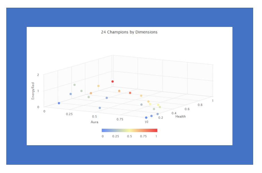 What is cluster analysis? It’s looking at naturally occurring groupings of champions based on their stats. OK, that definition is accurate but doesn’t help much. To better explain it, let’s say you have an Olympic size swimming pool and all 24 champions are ready to dive in. Before they dive in, you ask them to walk along one side of the pool (everyone on the same side.) You tell them to start at one corner and walk one meter for every point in health. OK, after walking, the champions are lined up by health ready to dive into the pool. Next, you say, “Jump in and swim away from this side of the pool. One meter for every 10 points of aura.” Great now the champions are swimming in the pool at different locations. Next, you ask them to dive down – one meter for every point of energy reduction. You also ask them to hold their breath as long as they can – come on, they are champions, they can do it.