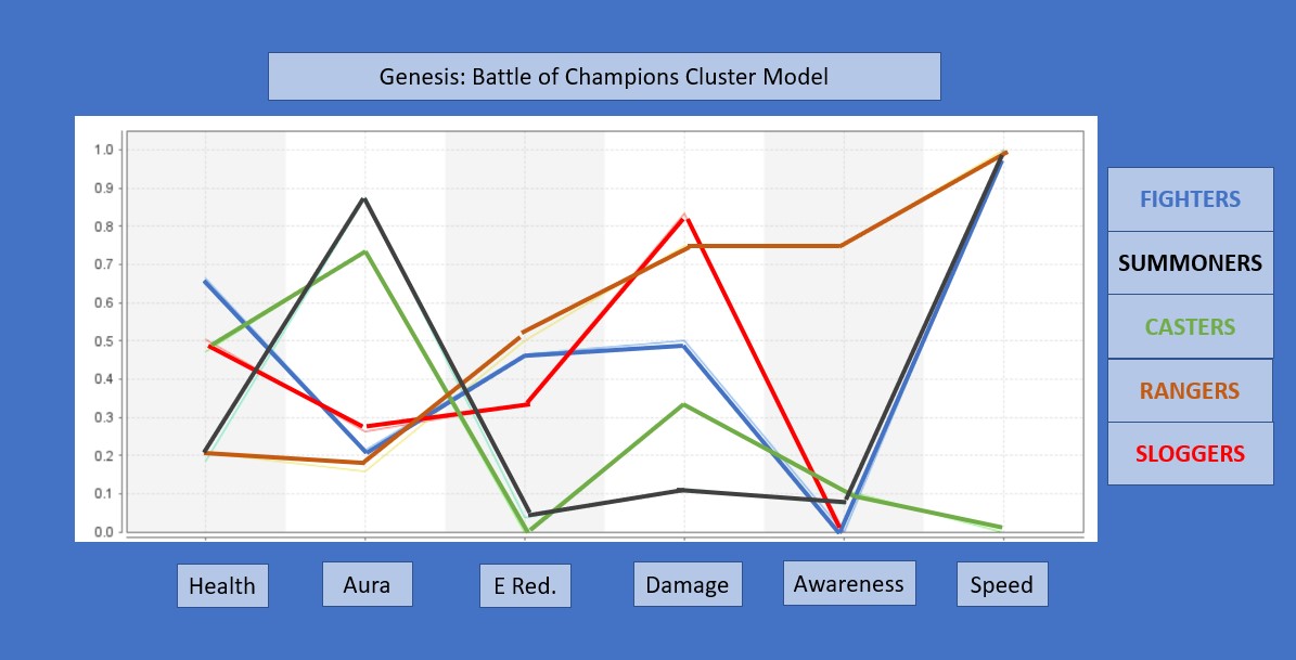 Quite a few ways exist for learning more about the Champions in Genesis. First, you can play the game. Nothing better than playing the game with friends to learn the capabilities of each champion and the associated cards. Second, you can read about the champions and watch videos. For example, the Chronowalkers on Youtube have a terrific series on the champions. But what else can you do after you’ve exhausted the first two options? You can do mathematical analysis. Lots of options here, one of which is Cluster Analysis.