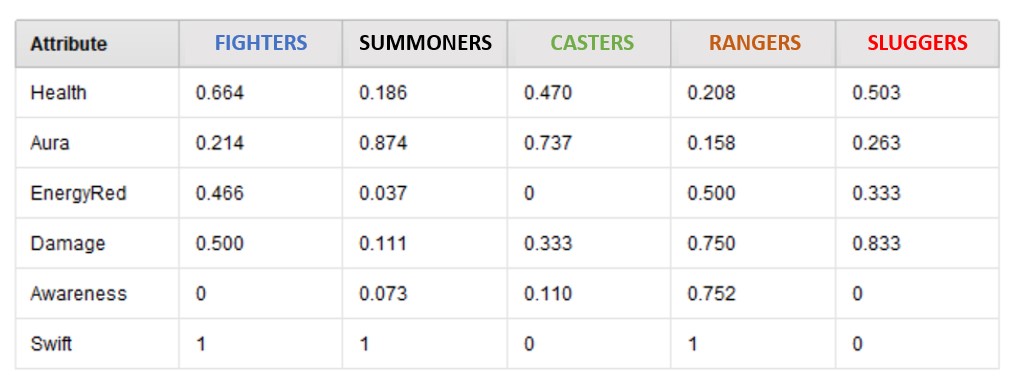 I believe the math came up with 5 distinct groups: Fighters, Summoners, Casters, Rangers, and Sluggers. These are nicknames I came up with to quickly describe them. The first three are pretty familiar, which tells me the math is right. The last two are interesting in their own right. Further below we will take a closer look at each one.